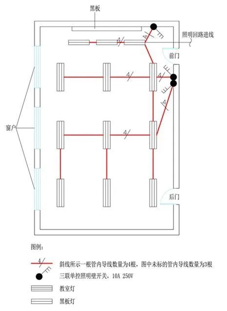 調光系統分多個回路控制。教室照明燈具第一橫排的每個燈具應由單獨回路開關控制,在使用多媒體教學時,可分別調節照明,照度。其余每一縱列燈具由獨立回路開關控制,如下圖: