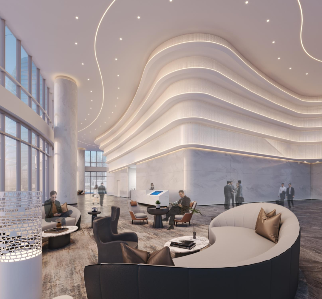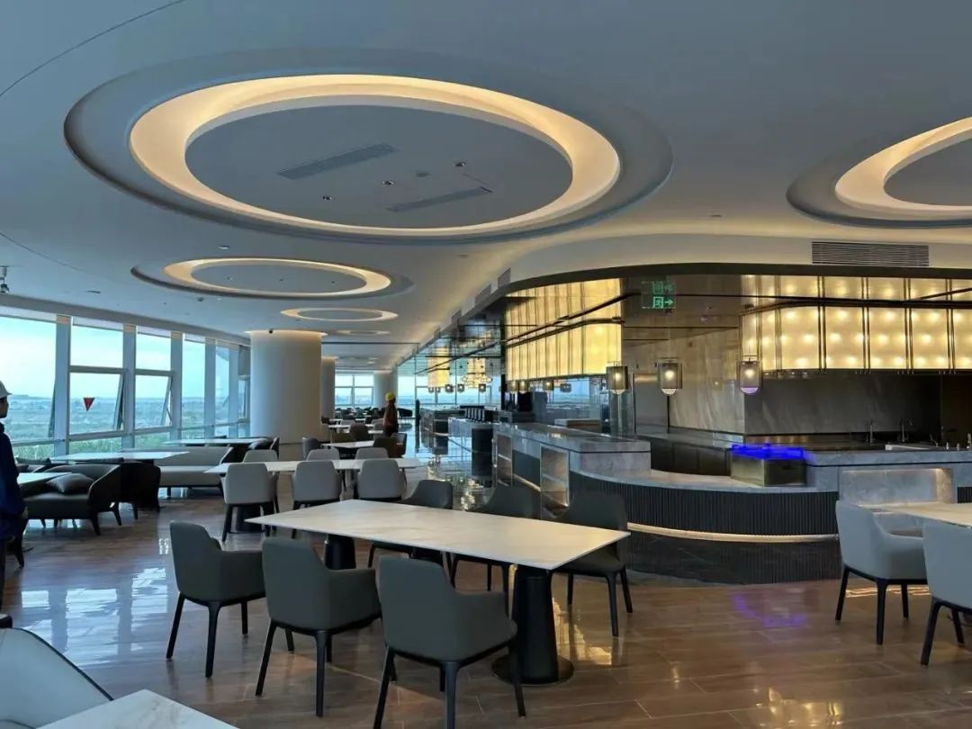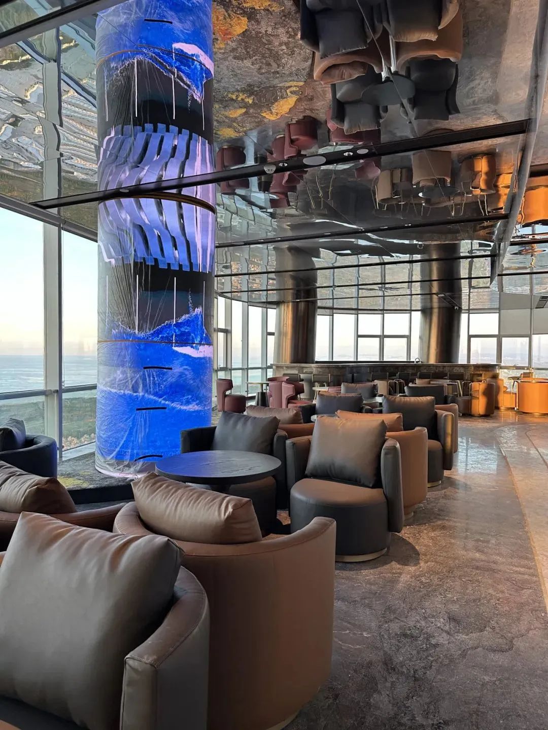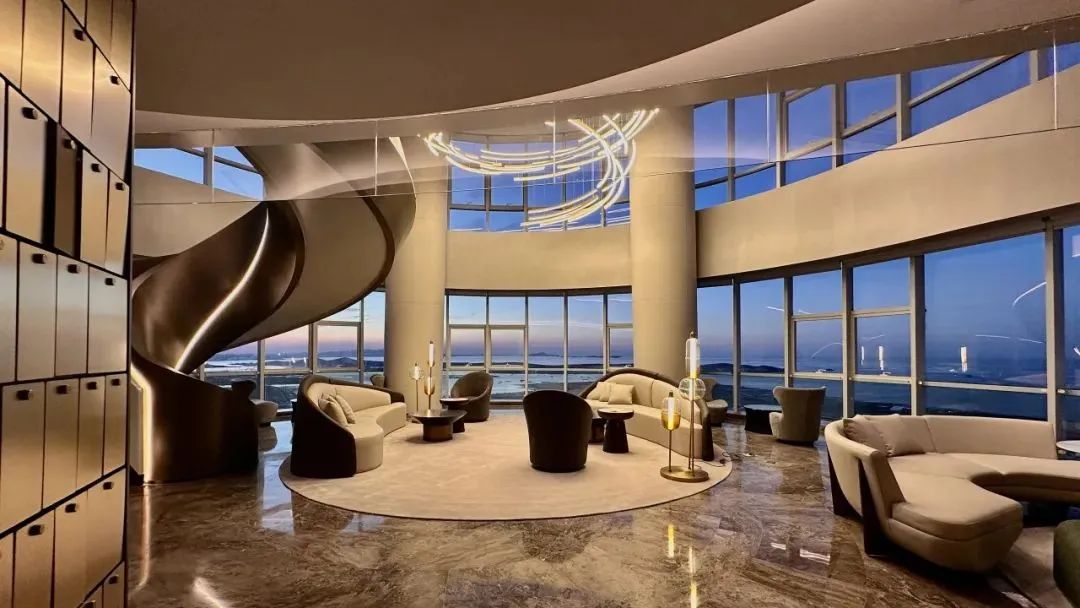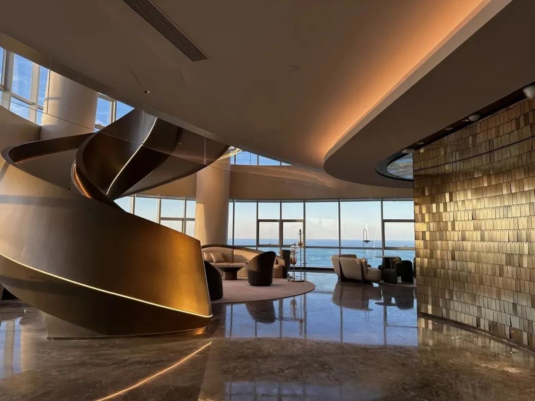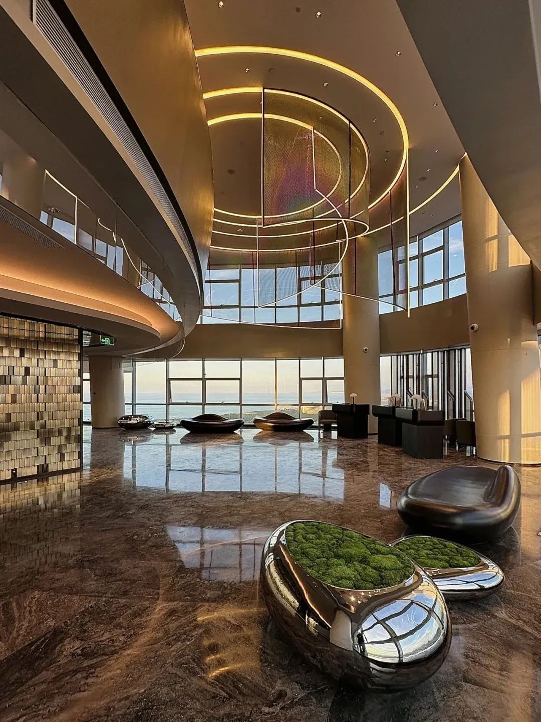 步入位于42層的酒店空中大堂,賓客們仿佛進入了一個流動的海森世界。這里的設計充滿了度假氛圍,每一處細節都透露著輕松與愉悅。大堂中創意采用的“金屬風動墻”,在歐切斯可控硅智能調光系統的映襯下,更是顯得波光粼粼、如夢如幻,讓賓客們在舒適的光環境中享受美好的時光。