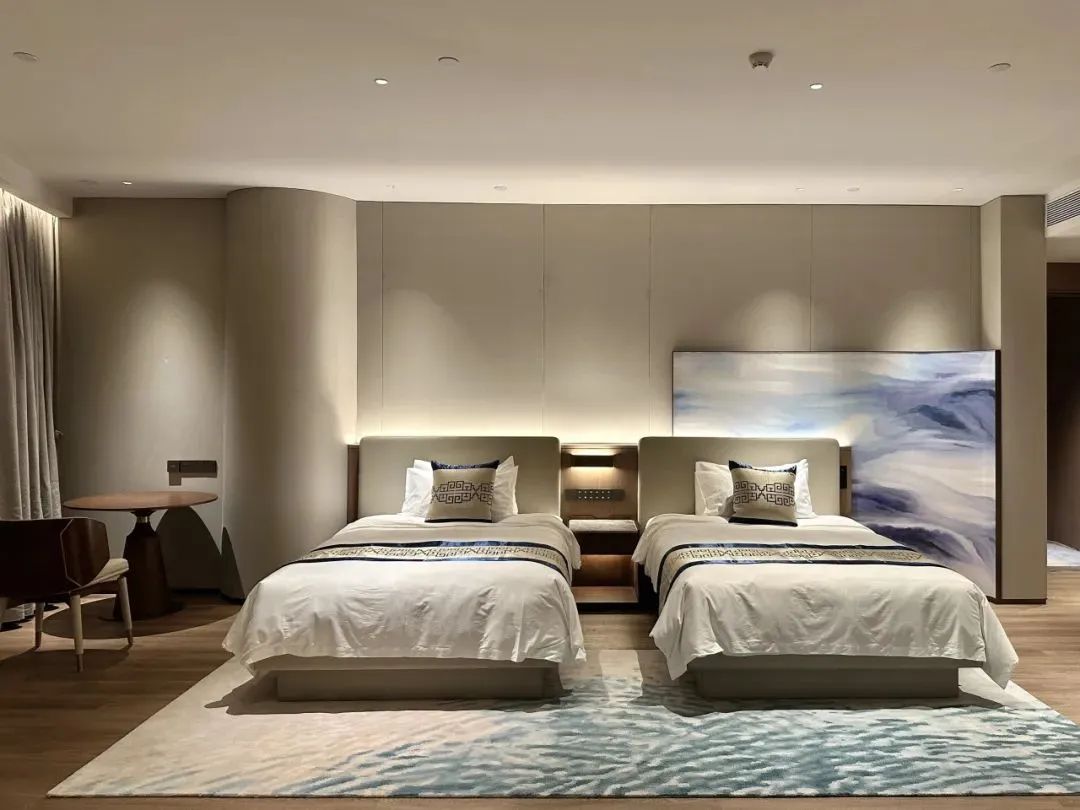 走進客房,仿佛步入了一個靜謐的時光走廊。墻面及地面采用大面積石材裝飾,既耐磨易清潔,又增添了些許文化氣息。房間內,各項現代設施一應俱全,而歐切斯可控硅智能調光系統根據空間布局與光線需求,提供個性化解決方案,讓居住體驗更加舒適愜意。隨著外部光源的變化,室內的裝飾肌理在燈光的映襯下變得更加豐富細膩,讓人仿佛置身于一個夢幻般的世界。