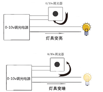 當0/1-10V調光器調大最大10V時,燈具滿亮度輸出。當0-10V調光器調制到0時,關閉燈具輸出。